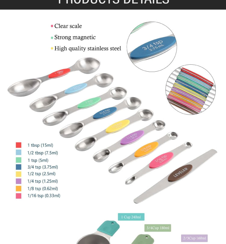 DUAL SIDED MAGNETIC MEASURING SPOONS SET:The double-end design of magnetic measuring spoons are suitable for most spice jars, so you don't need to shake the spices onto the spoon. You can not only avoid the waste of expensive spices, but also quickly finish the measurement. The round end of the measuring spoon is also very suitable for measuring liquid and powder.