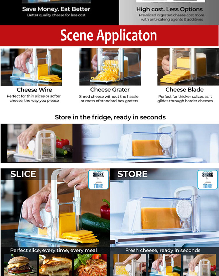 All-IN-ONE: The entirely new way to store, slice, and shred cheese in seconds. The Cheese Chopper is fast, safe, airtight, easy-to-clean, and creates the perfect slice every time. Our cheese slicers for block cheese fit any standard brick of cheese when used properly.