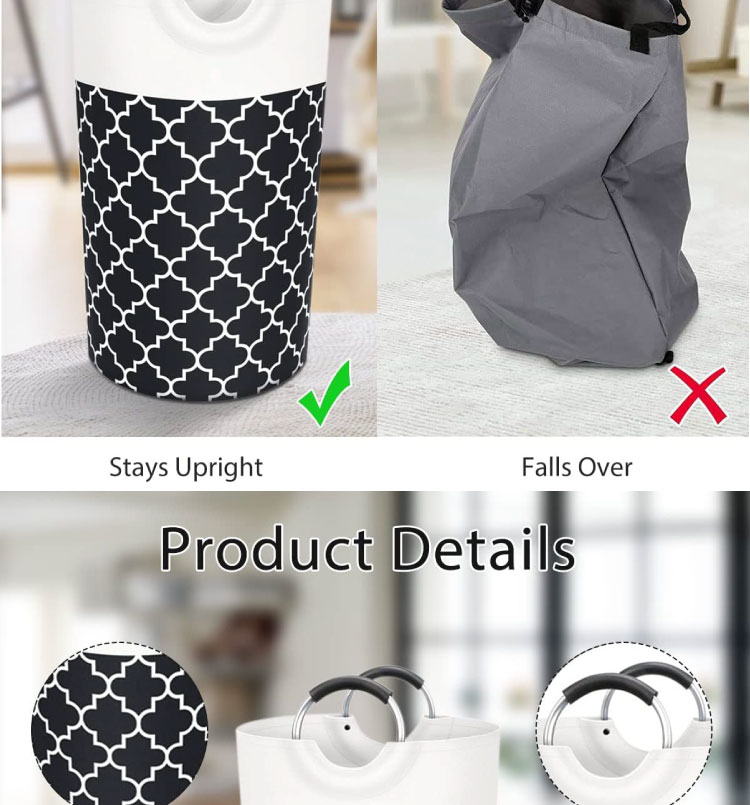 DOUBLE FABRIC WITH PE COATING:The laundry bin is made of durable double layer fabric with water-proof PE coating inside, so wet clothes can also be placed in the laundry hampers. This laundry bag with handle can hold dirty clothes and stand upright even when empty.