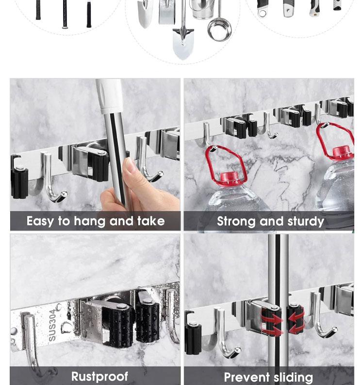 [Strongest Hold & Non-slip Design]-The broom and mop holder wall mount is made of rustproof 304 stainless steel, more durable than plastic materials. The broom hanger combines with anti-skid silicone, preventing scratches, slots are double rubber gripped to help keep a stronger hold on your items.