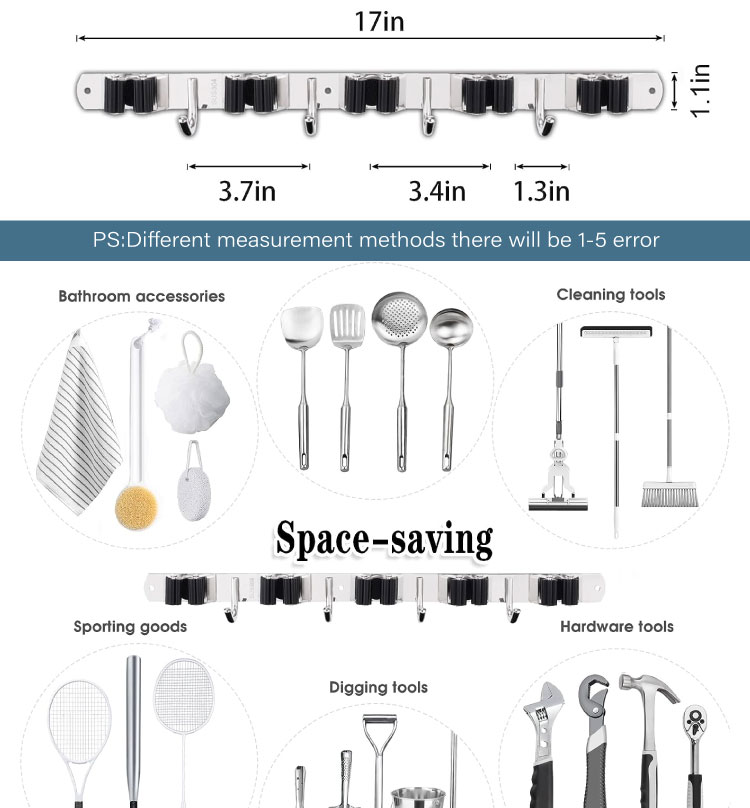 [Wide applications]-The broom storage organizer is designed to hold various household objects to save space and decorate. It’s large enough to hang your brooms, mops, racks, rags, brushes, gloves, baseball bats and so on. Suitable for kitchen, bathroom, garage, laundry, broom closet, washing storage and even works outdoors or in the shed for your garden tools!