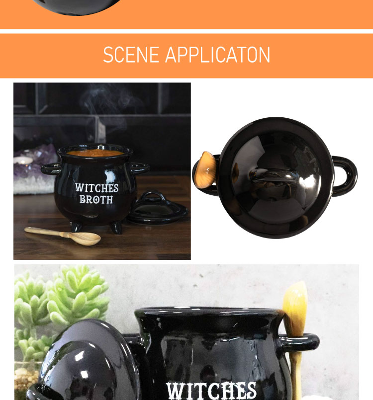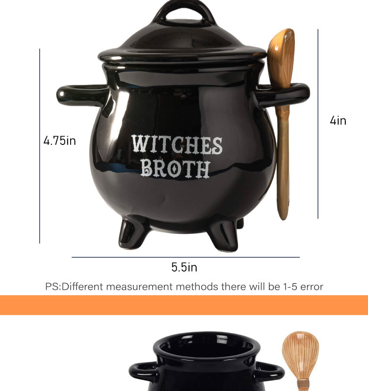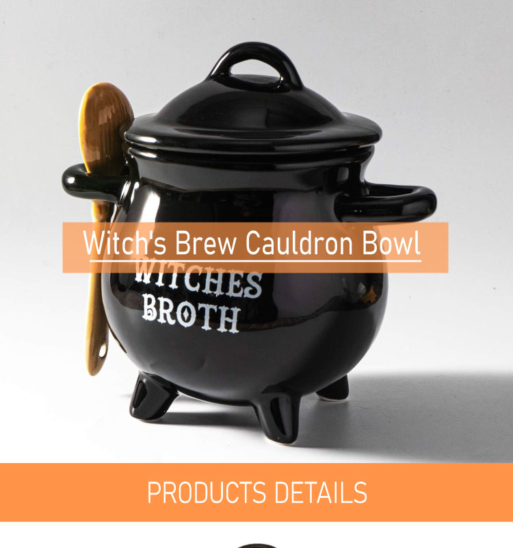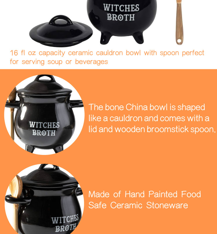 Description:20 fl oz Witch's Brew Cauldron Bowl with Lid and Spoon Spirit of Equinox Witches Broth Halloween Decor Tabletop Houseware
