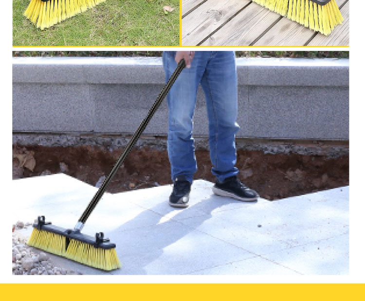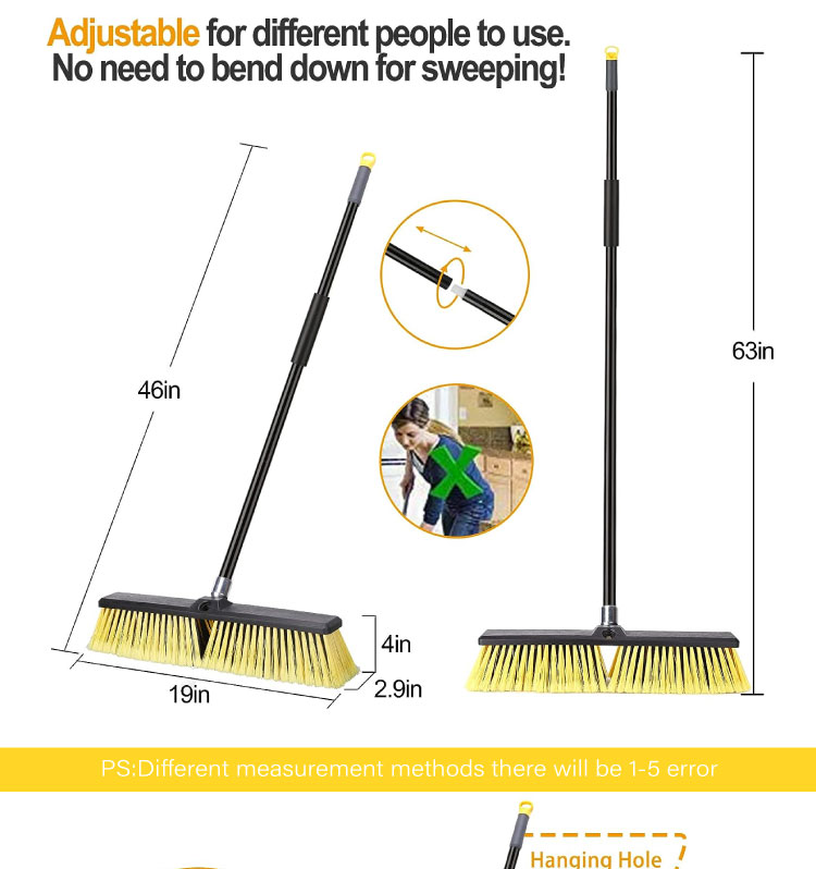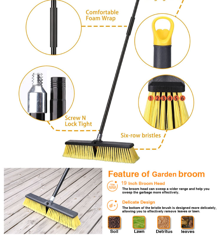6 Layer Hard Bristle -The garage broom is finished with 6 Layer stiff bristles for sweeping heavy things with forward speed or efficiency,such as grass, soil, sands, snow, leaves which tend to stick to the ground,plus ,it is suitable for using in wet or dry conditions,won't be rotten and deformed like a wooden broom.