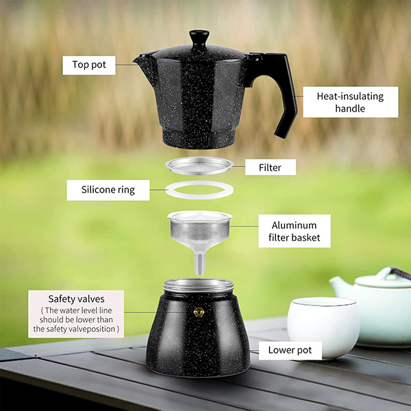 【High-Quality Material】 The aluminum material used to make this coffee maker is food grade, sturdy and odorless, so you don't have to worry about causing harm to your body. During use, the stovetop espresso maker will not leak or splash coffee.