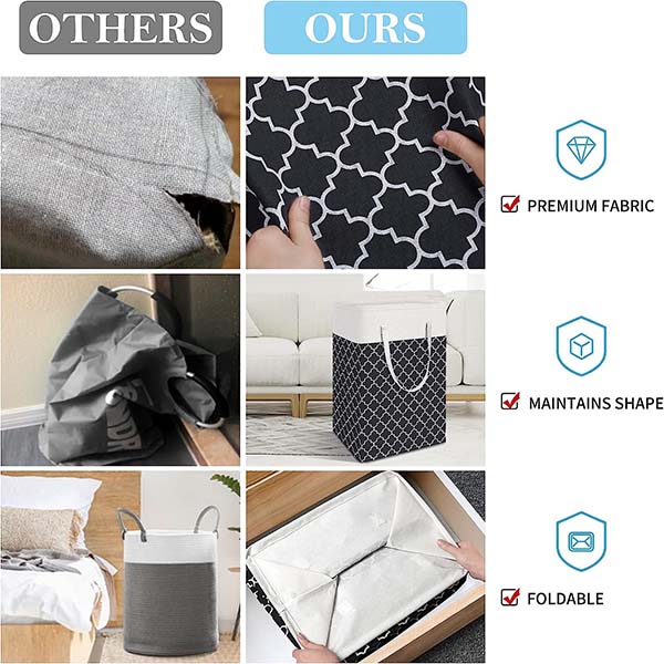 Freestanding Structure: With a sturdy iron wire frame sewn into the top edges, so the laundry basket stands firmly upright for a very long time even when empty. Simply stretch the dirty clothes hamper out and it will stand upright on its own.