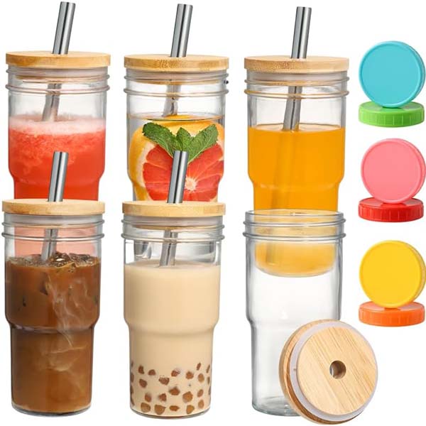 GLASS TUMBLER SET: Includes 6 Reusable glass cups 24oz/750ml, 6 natural bamboo lids, 6 stainless steel straws, 6 Colorful Airtight Lids with fits-most option for a variety of beverages. Glass boba cup after the use of cleaning methods are also very simple, you can choose to directly hand wash or dishwasher cleaning.