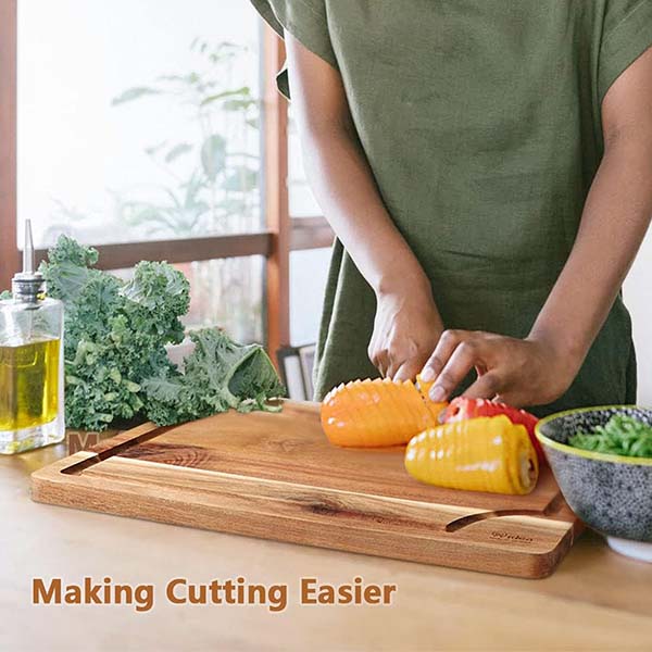 • LONG LASTING DURABLE EDGE GRAIN ACACIA - Our Acacia Edge Grain Cutting Boards are built of durable solid construction, this construction type is known to be extremely durable, to withstand heavy-duty chopping, and is highly desired for its 'self-healing' properties. Each knife cut goes between the wood fibers, rather than cutting through them. Each cutting board you receive is unique that has unique natural color and pattern.