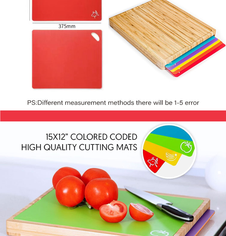 Description:Bamboo Wood Cutting Board Set with 6 Color plastic mat Coded Flexible Cutting Mats with Food Icons - Chopping Board Set