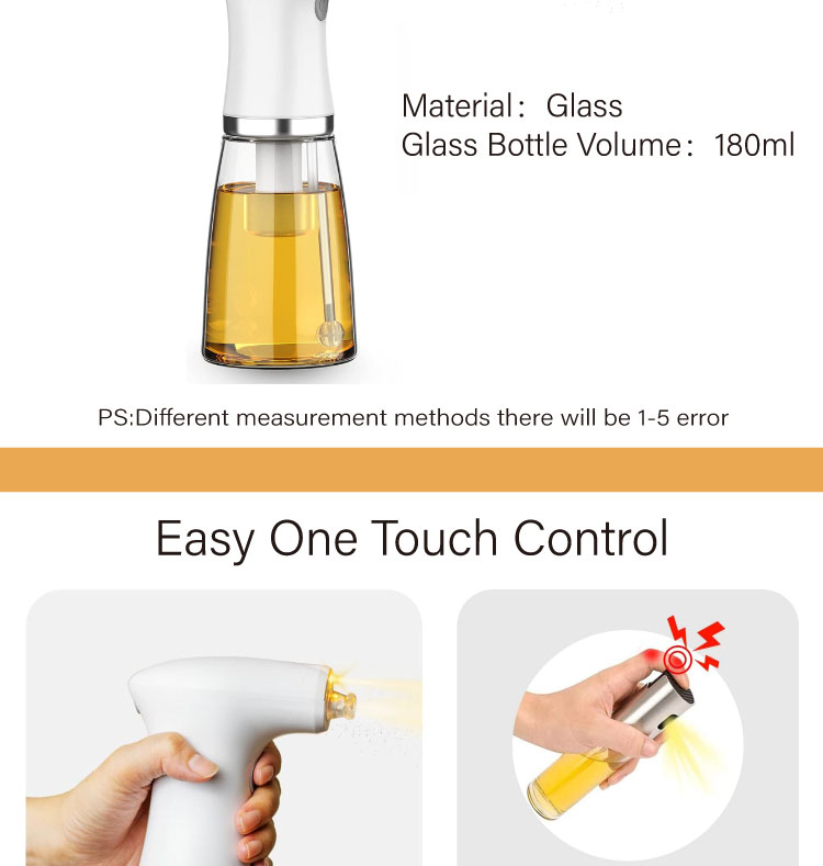 Description:Oil Sprayer for Cooking, Electric Oil Spray Bottle, Rechargeable Olive Oil Dispensing Oil Atomizer for Air Fryer,Salad,BBQ180ml