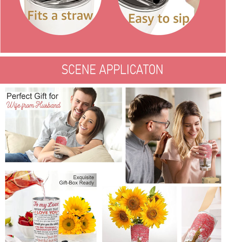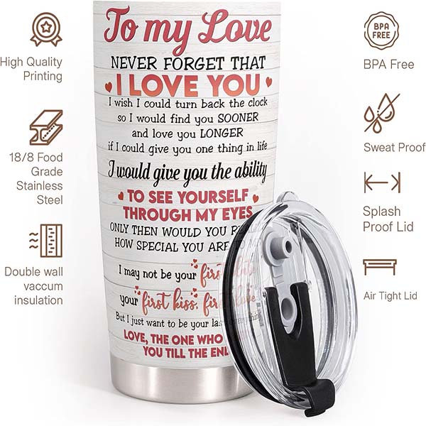 UNIQUE GIFT FOR THE LOVE OF YOUR LIFE Our high-quality Tumbler with heart-touching design will certainly be the perfect gift to the lover of your life, who loves you, cherishes and supports you in every situation. Presenting this gift to your wife as a sincere thanks for coming into your life and making your everyday worthwhile, every moment wonderful. In this way, you can express how you're grateful for the love and happiness she brings to your life.