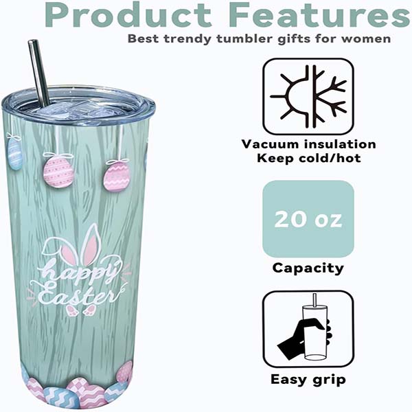 20 Oz Tumbler: The insulated tumbler is a 20 oz cup. And skinny tumblers with lids and straws can make you drink in two ways. The easter cup can as bunny mug, easter coffee cup, rabbit coffee mug, easter sippy cups, easter party cups, easter drinking glasses, gifts for girls easter, easter gifts adult, girls easter gift, easter gifts teens, easter gift wife, easter presents for teenagers, small easter gifts.