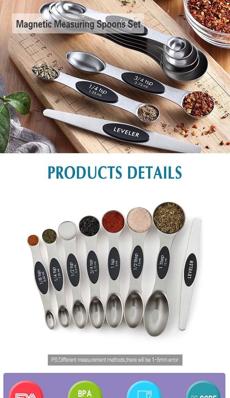 【DUAL SIDED DESIGNED】 The measuring spoons set design with two different style container on both sides, makes it compatible for measuring the dry and liquid Ingredients. The round end of measuring spoons set is perfect for measuring liquids, and the narrow end of measuring spoons is perfect for measuring powder and other solids. (Each measuring spoons have the exact same measurement of its opposite side)