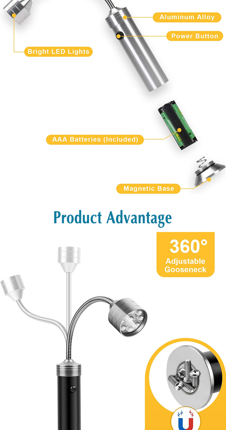 5inch FLEXIBLE GOOSENECK STRUCTURE and ADJUSTABLE SWIVEL HEAD make it possible to adjust the light angle and freely(no tools required). It fits most grills and it’s also perfect for workshops, garages and any places in dark.