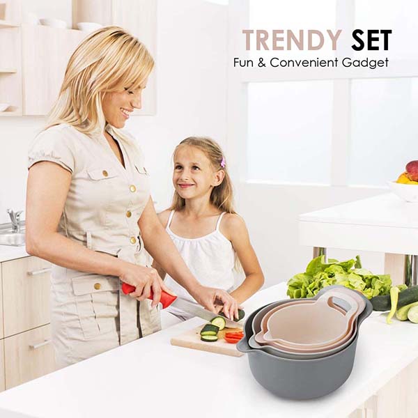 Set includes: 1 liter bowl (peach), 1.5 liter bowl (pink), 2 liter bowl (light grey) and 3 liter bowl (dark grey).