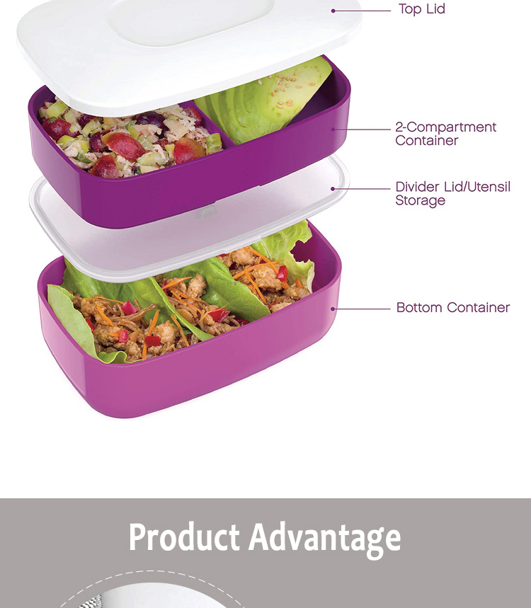 2 STACKABLE CONTAINERS: Top container features 2 compartments that each hold 3/4 cups of food while the bottom container holds 2 cups — together they’re perfect for packing a variety of foods in healthy portions