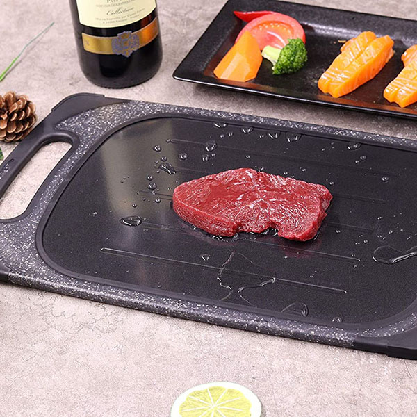 SIZE - The size of defrosting plate is 15.9*9.4 in. The large and flat surface of the black cutting board enables you to thaw multiple items together such as breast, bacon, chicken etc.
