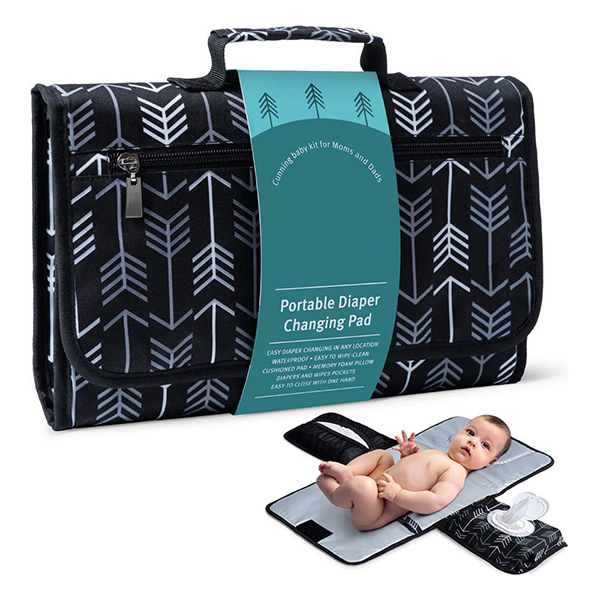 SINGLE HANDED CONVENIENCE: With its rapid-open hook and loop fastener, customized Wipes Pocket, minimum 5x Diapers Pocket and Zippered Pocket -- the Portable Diaper Changing Pad is the ONLY pad that leaves you one hand to hold baby, and the other for their changing mat for a quick nimble change!COMFORTABLE: As much as your little cub wants out of those wet diapers, they still don’t want a cold, hard travel changing pad. Our Baby Changing Mat has a padded surface, with a soft memory foam pillow to cradle their head. Opened, it gives baby a soft 23.5 x 13.5” insulated surface to wriggle on.GREAT GIFT: the inside is waterproof and effortless to wipe clean. Available in arrow print, it’s for moms and dads to proudly show off, and makes perfect sense as a gender neutral baby shower gift for baby girl or boy. Folded it’s 13.8 x 8.4in. to fit any bag or diaper backpack with a diaper clutch strap for your stroller, wrist or toys.