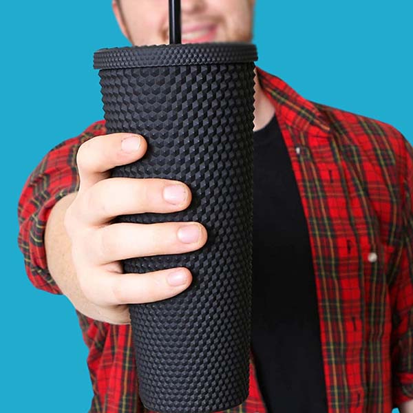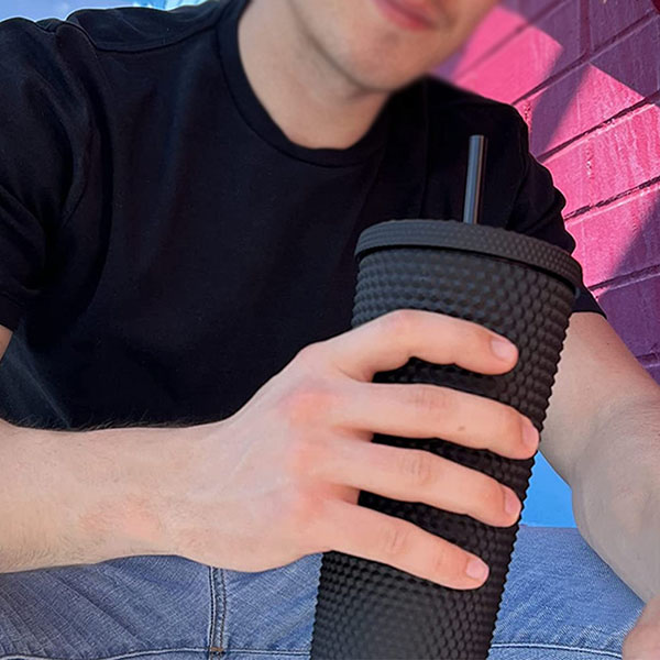 -A matching studded tumbler with lid and straw can be used for any cold beverage. Best as an iced coffee tumbler, smoothie cup, & water cup. Also used for drinking protein shakes, ice tea & juices.